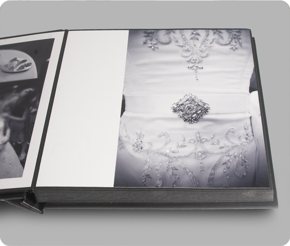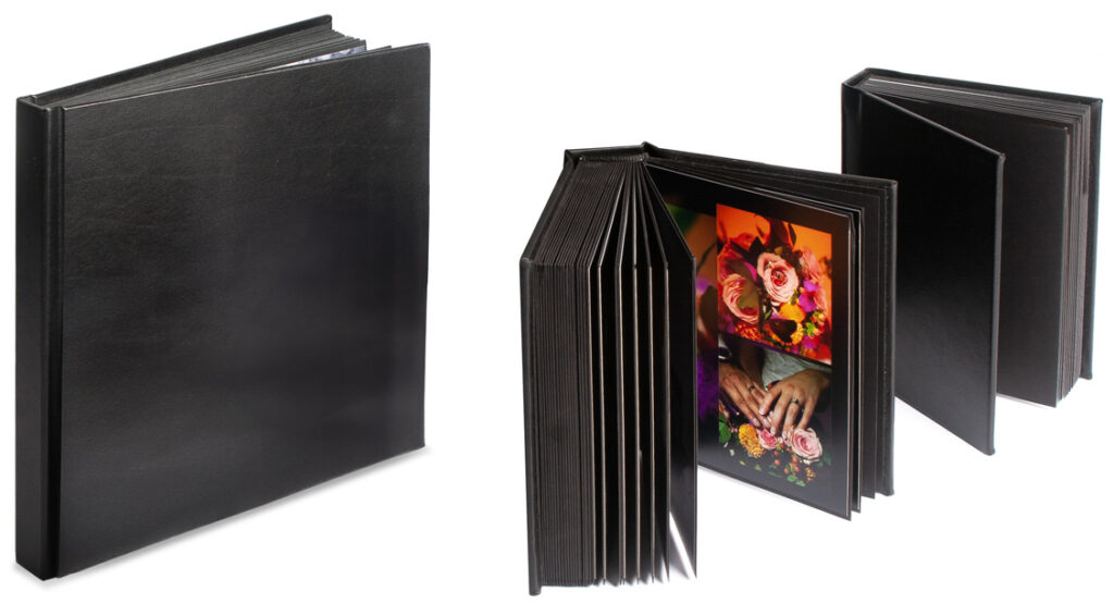 These distinguished albums combine prints with beautifully handcrafted black bonded leather covers. Each image is floated with a 1/16" border to create an elegant matted appearance that draws attention to your photography.